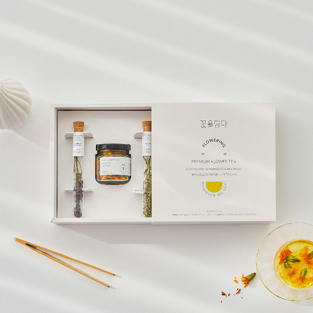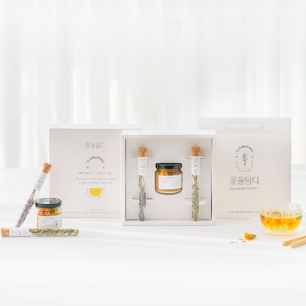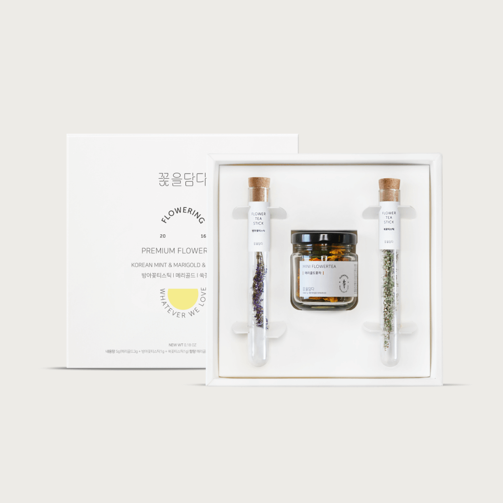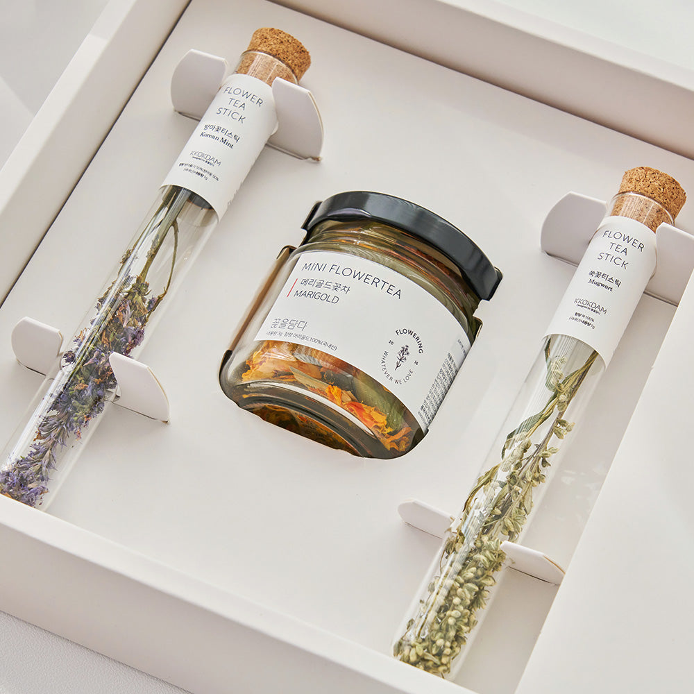 This gift set consists of the most popular original marigold flower tea in a flower bud shape and two types of flower tea sticks, making it a great gift set to experience various types of flower tea. In Korea, the time and process of brewing flower tea is considered a "healing" ritual. Our tea culture involves placing the flowers in a beautiful mug, slowly pouring boiled water over them, and savoring the fragrance and warmth of the tea.