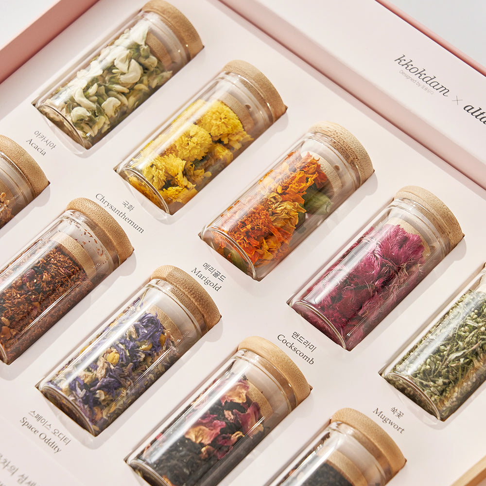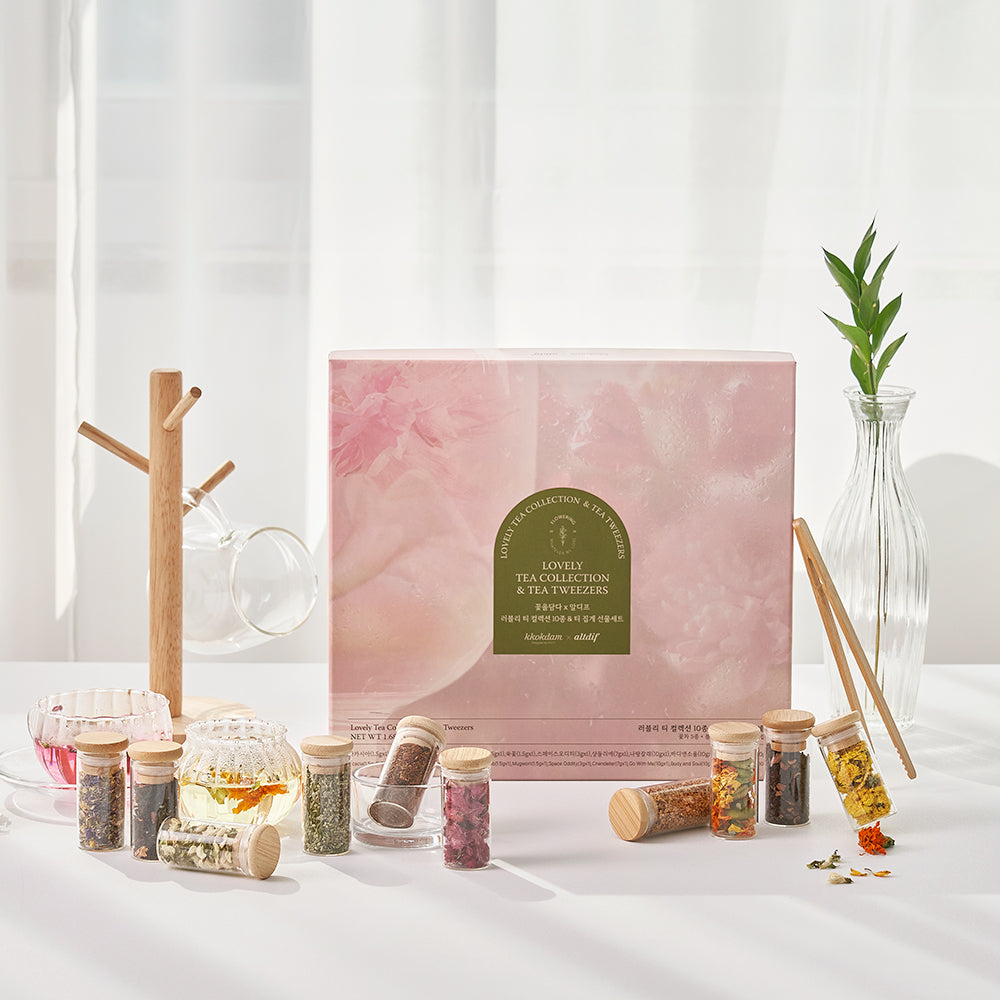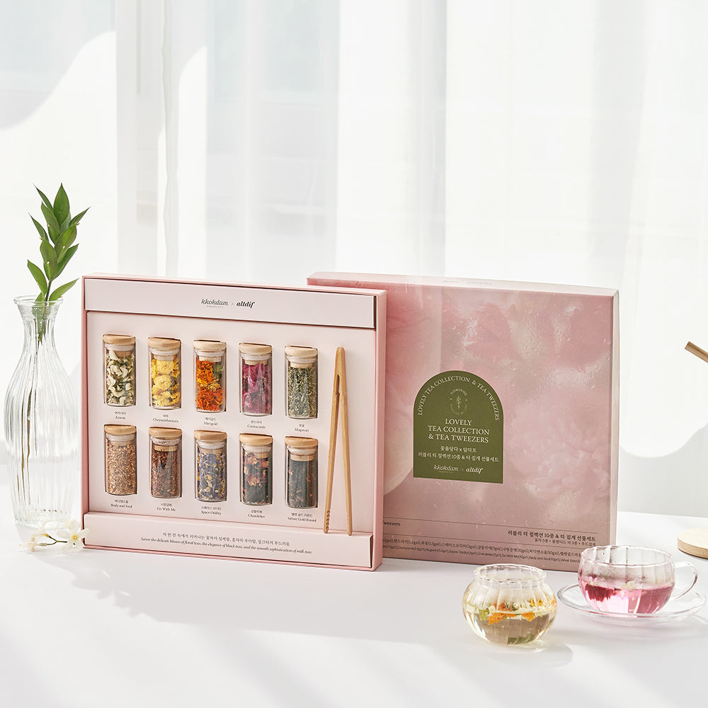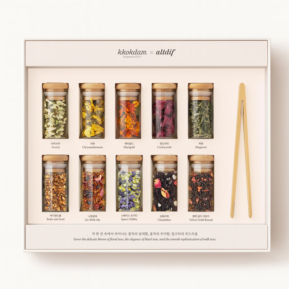 A complete tea gift set that brings together KKOKDAM’s pure flower teas and ALTDIF’s signature blended teas—crafted to enjoy both clarity and depth in one elegant box.
