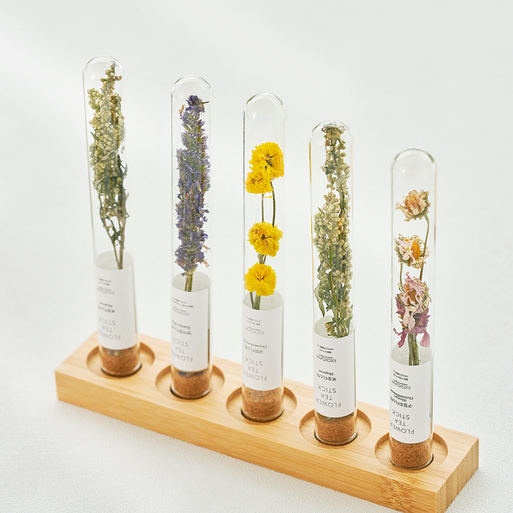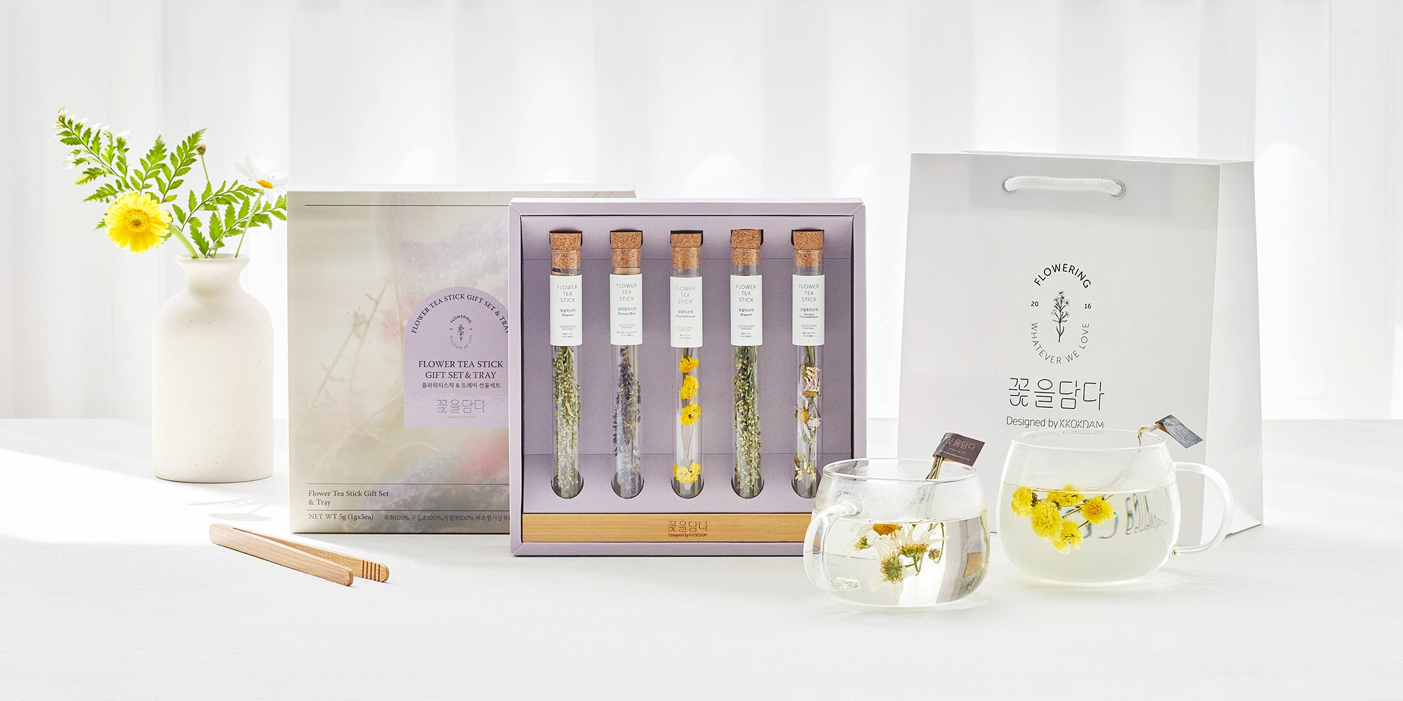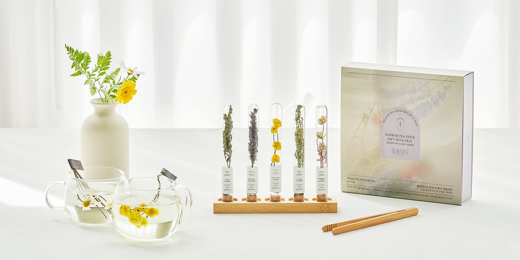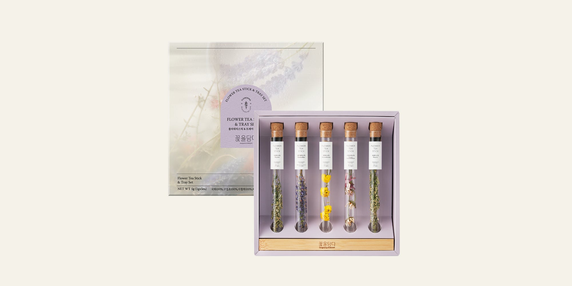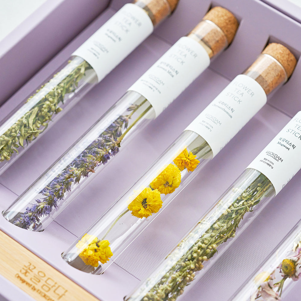 The Flower Teastick & Tray Gift Set features KKOKDAM's signature flower teastick and a beautifully crafted wooden tray for displaying the teasticks. Enjoy the visual beauty of the flower teas and savor the unique flavors and aromas of each variety.