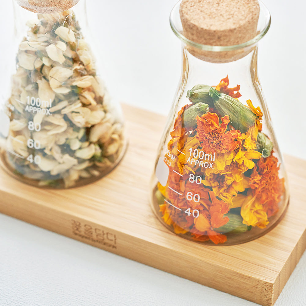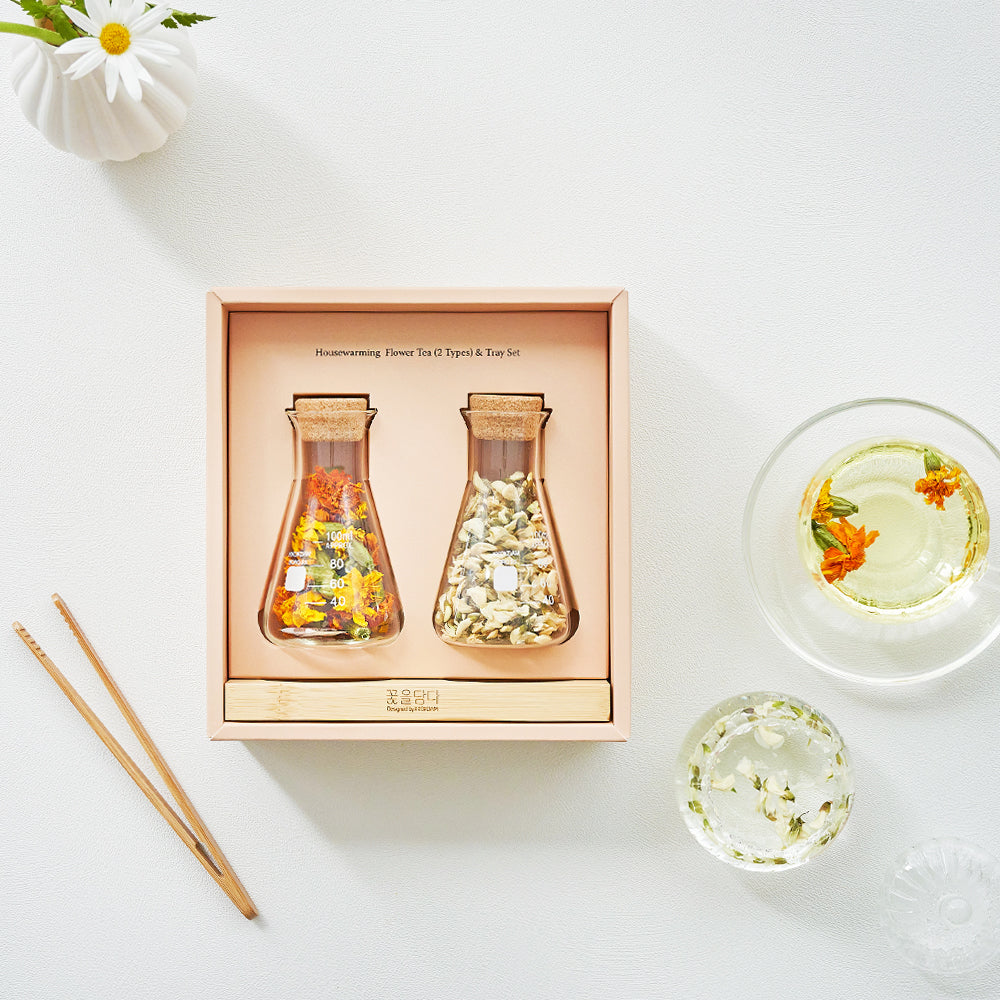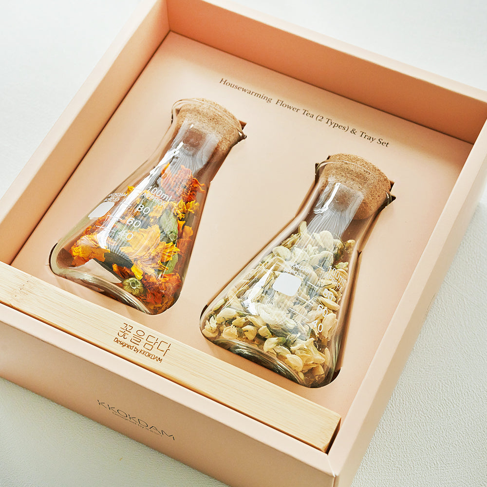 Housewarming Flower Tea Gift Set features two popular flavors of flower tea from Korea, perfect for those who want to experience these beloved varieties.featuring a premium wood tray designed to showcase your glass bottles.
