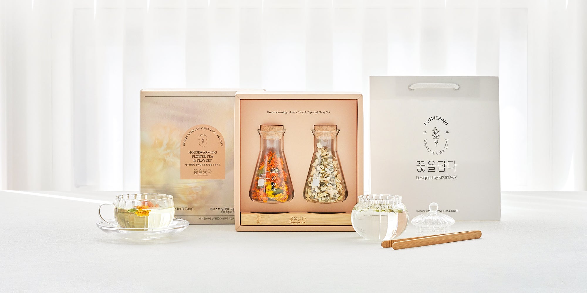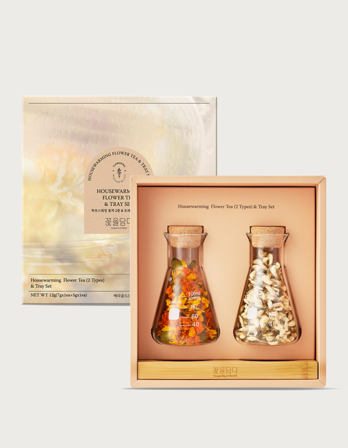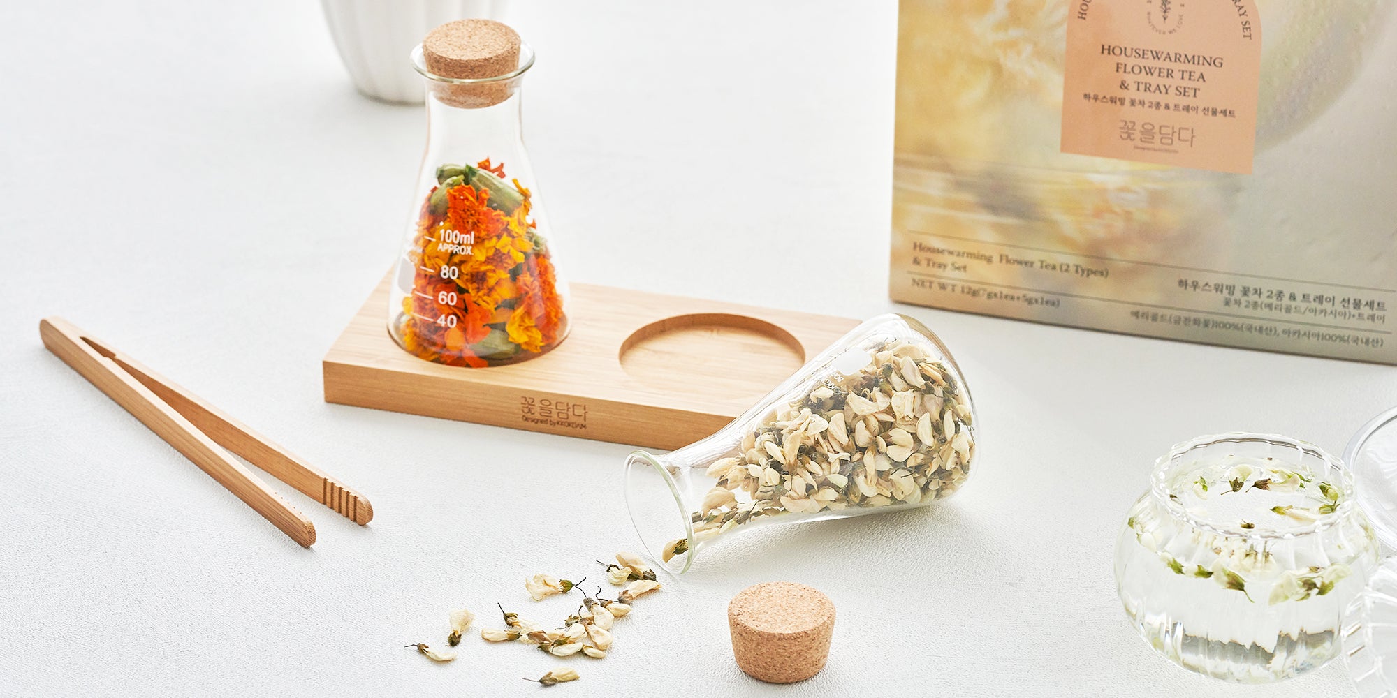 Housewarming Flower Tea Gift Set features two popular flavors of flower tea from Korea, perfect for those who want to experience these beloved varieties.featuring a premium wood tray designed to showcase your glass bottles.